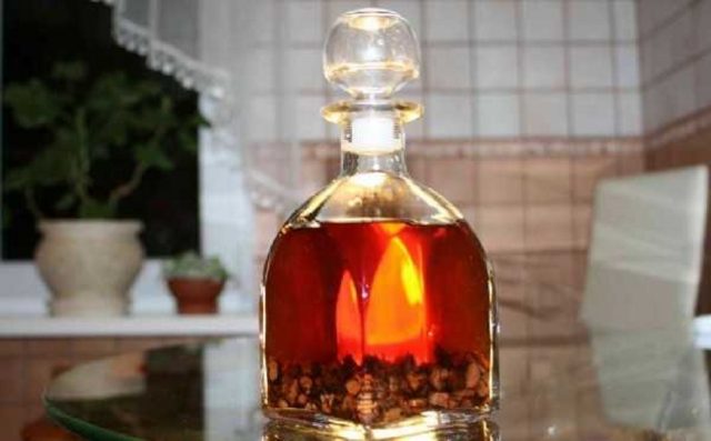 - Lấy ra khỏi bếp và lọc qua bất kỳ bộ lọc nào. Nó có thể là gạc, bông gòn hoặc vải mỏng. Dung dịch đã hoàn thành được đổ vào lọ thủy tinh tối màu và để trong một tuần ở nơi tối.