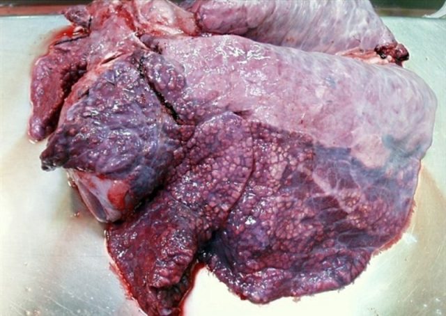 Bức ảnh chụp một lá phổi của một con lợn bị chết do tụ huyết trùng.