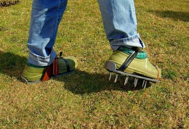 - Máy sục khí chân là phiên bản đơn giản nhất của máy đục lỗ. Hai chiếc đinh kim loại có gai được gắn vào đế giày. Đang đi trên bãi cỏ, một người bị gai đâm xuyên qua đất.