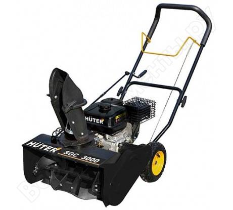 - Máy quét tuyết Huter sgc 3000 được thiết kế để dọn tuyết cao đến 30 cm Máy thổi tuyết chạy xăng có một cần gạt đặc biệt cho phép bạn chọn hướng để ném tuyết. Để làm điều này, chỉ cần xoay tay cầm 190 độ. Cần gạt bên cạnh người điều khiển. Bộ làm lệch hướng trên máng xả phải được điều chỉnh bằng tay. Một con cừu được sử dụng để cố định góc nghiêng đã chọn.