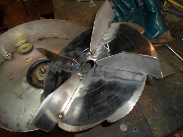 - Tiếp theo, bạn cần tạo một cánh quạt cho cánh quạt tuyết, tức là cánh quạt sẽ ném tuyết. Dao đĩa tông đơ được lấy làm cơ sở. Nhưng trước tiên, bốn lưỡi 250x100 mm được cắt bằng thép. Lý tưởng nhất là các phôi được làm có cùng kích thước để tránh mất cân bằng. Các lưỡi hoàn thiện được hàn chéo vào đĩa.