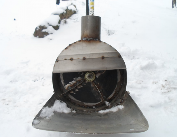 Thiết bị của thiết bị loại bỏ tuyết là đơn giản. Phần tử làm việc là một vòi phun, được đặt thay vì dao. Nó là một cánh quạt với các cánh quạt. Để sản xuất bộ phận này, bạn cần thép có độ dày 1,5 mm. Bánh công tác phải được đặt trong vỏ - ốc. Đối với sản xuất của nó, một đoạn ống có đường kính lớn được sử dụng, thường là trong khoảng 300 mm.