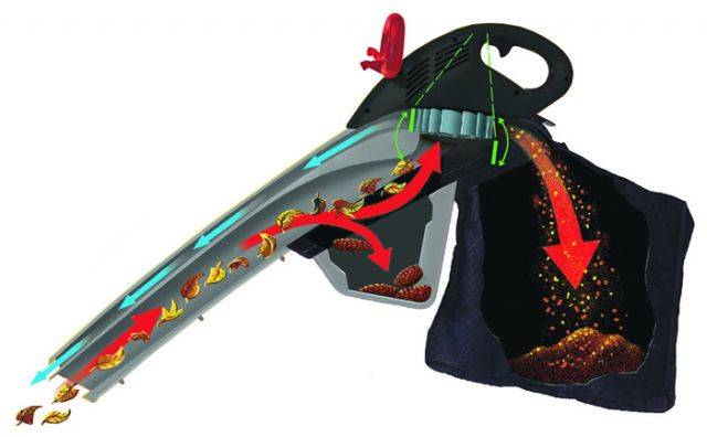 Thiết kế của máy thổi sân vườn khác nhau một chút tùy thuộc vào chức năng.Thiết bị tiêu chuẩn của các đơn vị đơn giản nhất bao gồm một ống thổi và một động cơ. Nếu chúng ta đang nói về một máy hút bụi sân vườn, thì một chiếc máy như vậy sẽ được trang bị thêm một túi đựng rác. Để xay các chất hữu cơ, nhà sản xuất sử dụng các loại dao đặc biệt. Nguyên lý hoạt động và thiết kế thông thường của máy hút bụi sân vườn có chức năng băm cỏ bạn có thể xem trong hình dưới đây: