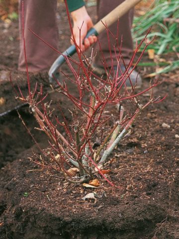Để bụi cây bén rễ tốt hơn sau khi cấy ghép, cần chuẩn bị trước. Họ làm theo cách này: vào mùa hè hoặc mùa thu, một rãnh tròn được làm xung quanh thân cây với chiều sâu và chiều rộng khoảng 25 cm, đổ đầy mùn tơi xốp và rắc đất thường lên trên. Đến khi cấy, bụi cây sẽ bén rễ vào tầng hữu cơ. Ngoài ra, trước khi cấy cây, tiến hành cắt tỉa vào mùa xuân: cắt bỏ những cành dày, bệnh và khô.