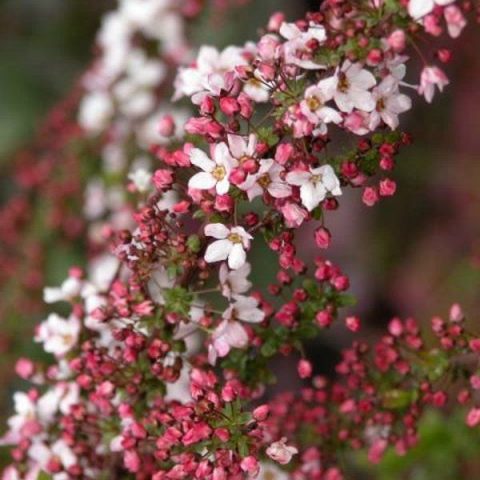 Sự đa dạng của Shiroban spirea nhiều màu của Nhật Bản, có hình khiên dày đặc các chùm hoa hai màu, có thể là do loại cỏ hoa dày đặc.