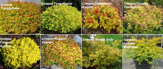 Tên của meadowsweet "màu vàng" là do màu sắc của các phiến lá của cây bụi. Một số loài không thay đổi trong suốt mùa, trong khi ở những loài khác, màu sắc của bản lá chuyển từ vàng tươi sang cam rực.