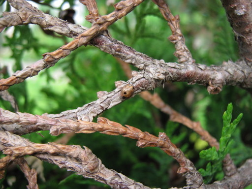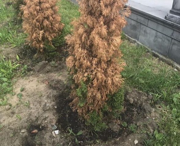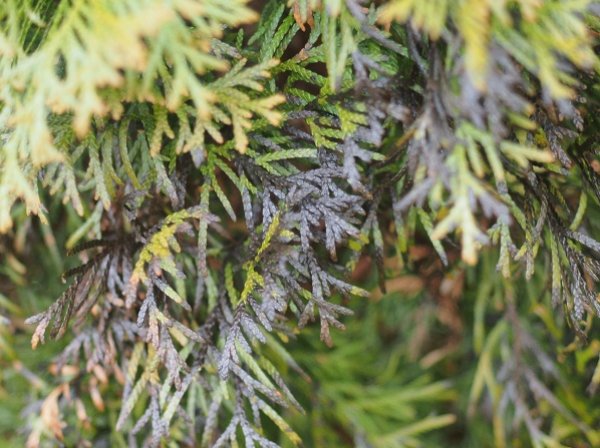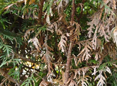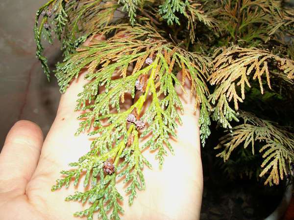 - chồi thuja bị xỉn màu và đổi màu thành nâu hoặc vàng bẩn;