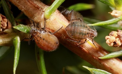 Các loài gây hại thuja như rệp thuja, có thể được nhìn thấy trong ảnh, rất có thể làm hỏng vẻ ngoài của thuja. Những con côn trùng nhỏ màu xám này hút nước từ chồi non ở độ tuổi 2 - 3 năm, cùng với khả năng sinh sản đáng ghen tị và lối sống thuộc địa của chúng, khiến chúng trở nên rất nguy hiểm đối với những cây suy yếu.