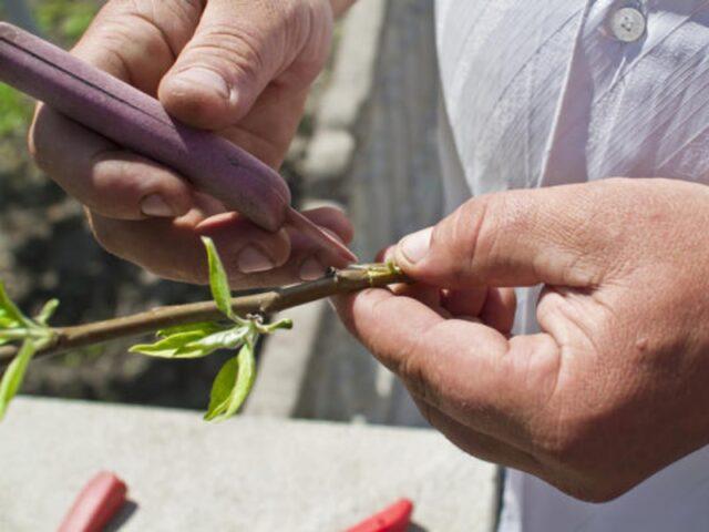 Để ghép cành, cần cắt bỏ chồi ở phần giữa của chồi giống bằng dao sắc có tấm chắn. Sau đó, thực hiện một vết cắt hình chữ T trên chồi gốc ghép và gấp các mép của vỏ cây lại. Sau đó, lái tấm chắn thận dưới nó. Trả lại vỏ cây về vị trí cũ, dùng thuốc var Garden phủ lên vết ghép. Nếu mọi thứ suôn sẻ, thận sẽ bắt đầu phát triển trong một tháng.