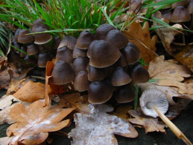 Mycena có tính kiềm. Sự khác biệt chính so với chân xanh là kích thước lớn hơn và có mùi hăng của bột giấy. Ở nấm non, nắp có hình bán cầu, khi lớn lên sẽ trở thành hình bán cầu, ở trung tâm ở bất kỳ độ tuổi nào bạn cũng có thể nhìn thấy một củ. Đường kính - 1-3 cm. Màu đầu tiên là nâu kem, sau đó nâu vàng. Thân dài, rỗng, cùng màu với nắp, bên dưới hơi vàng, có các phần phát triển là một phần của sợi nấm. Ở nấm trưởng thành thường không nhìn thấy được nên có vẻ ngồi xổm. Cùi mỏng, dễ vỡ, có mùi khó chịu của hóa chất. Tranh chấp có màu trắng, minh bạch. Ra quả từ tháng 5 đến cuối thu. Nó được tìm thấy ở nhiều vùng của Nga, mọc thành từng đám lớn trên nón linh sam và cây kim rơi. Mycena kiềm được coi là không ăn được do có mùi hăng và kích thước nhỏ.