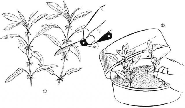 Đối với nhân giống bằng giâm cành, chúng được chuẩn bị sơ bộ: chúng được cắt vào giữa tháng 7, các bản lá ở phía dưới được cắt bỏ và phần trên được cắt ngắn đi một nửa. Sau đó, cây được đặt trong 2-3 giờ trong một chất kích thích sinh trưởng - đây là Epin, Kornevin. Khi kết thúc quy trình, vết cắt được rửa sạch và chuyển sang giá thể ẩm bao gồm mùn, than bùn và đất màu mỡ.