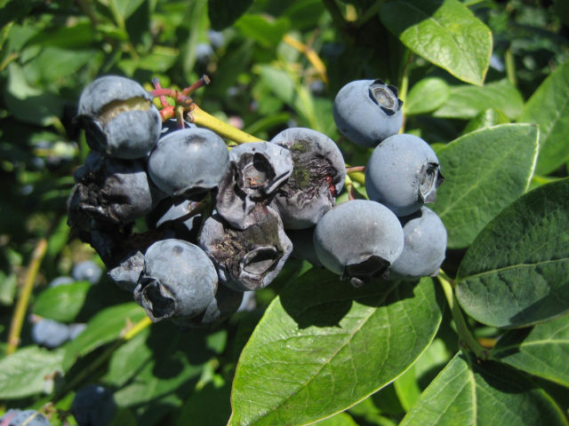 Thông thường, quả và lá của quả việt quất bị ảnh hưởng bởi nấm Monilinia vaccinenii-corymbosi. Các quả đã phơi nắng sẽ phát triển như bình thường, nhưng không đạt độ chín và bị khô sớm. Lần lượt các lá và chồi non của cây chuyển sang màu đen và rụng.
