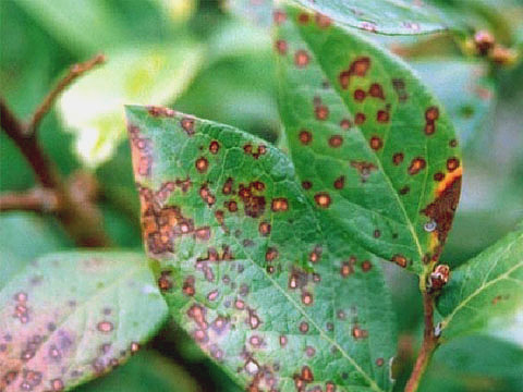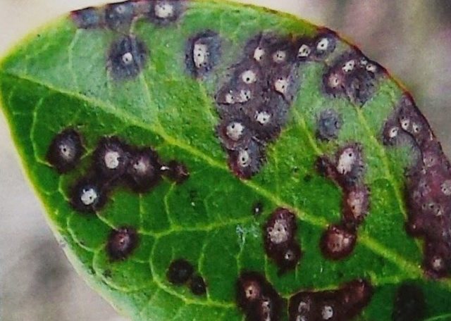 Căn bệnh dưới tên này được đặc trưng bởi sự xuất hiện của các đốm tròn có viền màu đỏ tươi trên bản lá của quả việt quất. Khi bệnh tiến triển, lá chuyển sang màu đỏ và chết hoàn toàn. Tuy nhiên, trong giai đoạn đầu của bệnh, bạn có thể cố gắng cứu bụi bằng cách phá hủy tất cả các lá bị ảnh hưởng.