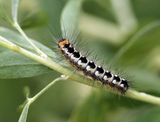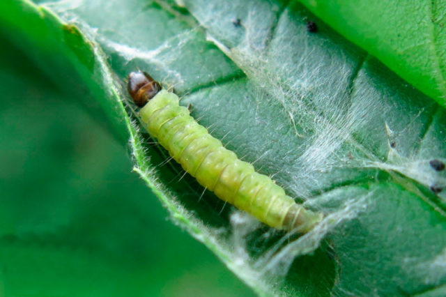 Không giống như các mẫu vật trưởng thành, thu hút sự chú ý với màu trắng như tuyết, sâu bướm của sâu ăn lá có màu xanh lục nhạt và khó nhận thấy trên nền tán lá. Ở hai bên thân và trên lưng, những con sâu bọ này có những sọc sẫm màu hơn, trên đầu có thể nhìn thấy những đốm đen có màu nâu bóng. Giống như tất cả các loài sâu bướm, sâu ăn lá là loài gây hại cho lá, nhưng chúng không chỉ ăn lá mà còn quấn mình trong đó để bảo vệ chúng khỏi các loài chim. Vì lý do này, mạng nhện thường được nhìn thấy trên các đầu chồi bị sâu bệnh.