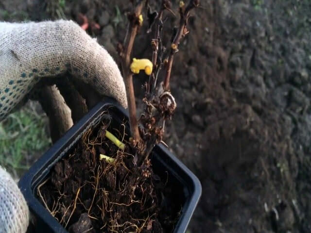 Gốc đặt vào hố, rắc đất trộn cát và mùn thành từng phần bằng nhau, giẫm nát. Sau đó, một xô nước được đổ dưới bụi cây. Nếu đất chua phải bón vôi tôi (300 g) hoặc tro củi (200 g). Các cây non được đặt cách nhau nửa mét.