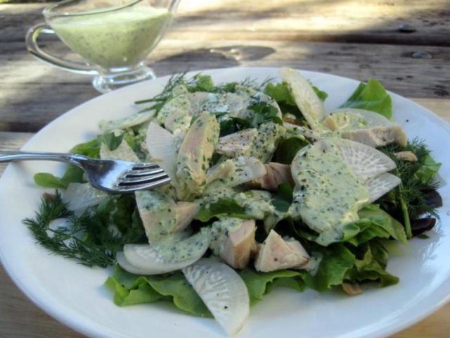 - Nước sốt đã chuẩn bị được rưới lên salad và dọn ra bàn.
