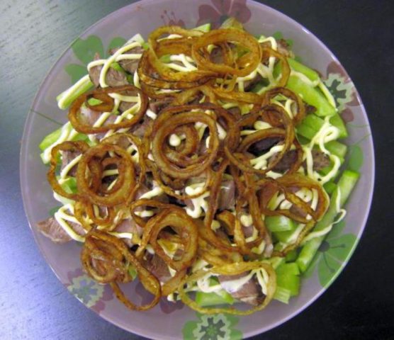 - Bày salad thành từng lớp trên một đĩa phẳng: củ cải, thịt, sốt mayonnaise và hành tây.