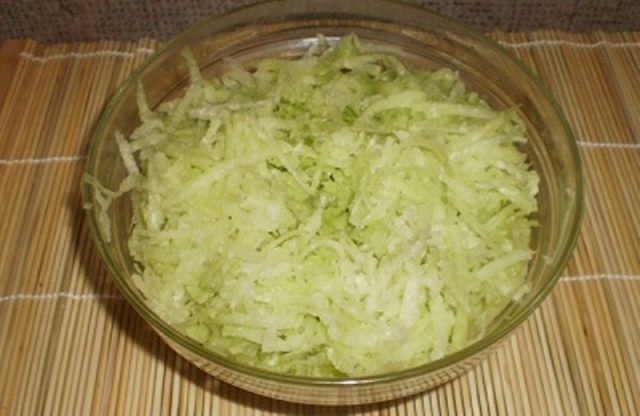 - Rau răm gọt vỏ, cắt sợi. Thêm muối và để nước trái cây trong 5 phút. Chất lỏng được rút hết.