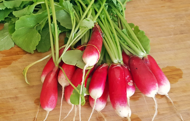 Củ cải ăn sáng kiểu Pháp có lá hình hoa thị nhỏ gọn. Lá cũng giống như rau ăn củ, không có vị đắng, được dùng để làm món salad.