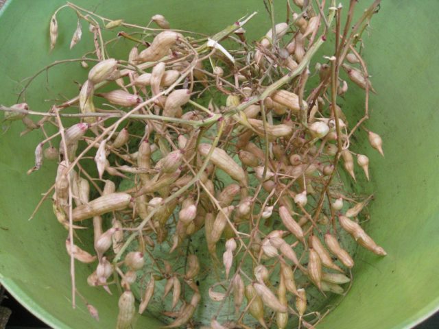 Hạt giống đã sẵn sàng để thu hoạch khi vỏ quả chuyển sang màu vàng. Sau đó, các bụi cây được cắt bỏ hoàn toàn và để treo trong phòng thông gió cho đến khi tinh hoàn khô hoàn toàn. Thời gian của quá trình là 2-3 tuần.
