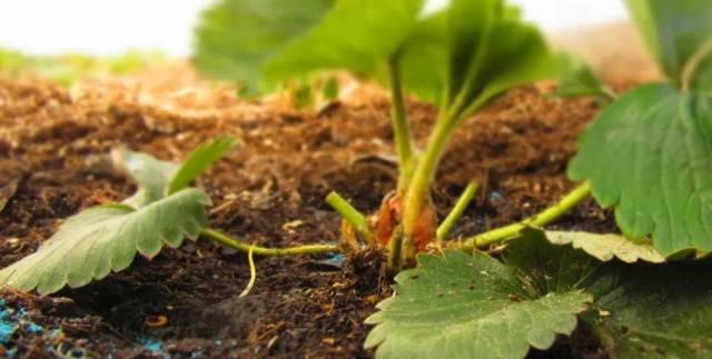 - Trước khi trồng cây con, đất bên trong hố được làm ẩm bằng nước. Fossa được làm rộng để hệ thống rễ nằm tự do. Rải đất hạt giống dâu tây đến mức cổ rễ. Đây là điểm phát triển của dâu tây và nên ở trên mặt đất.
