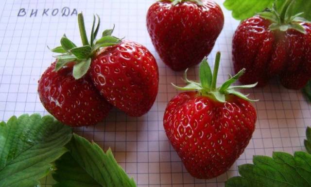 Dù có kích thước khổng lồ nhưng bên trong quả mọng dày đặc. Cùi ngon ngọt, mềm mại với hương vị anh đào. Khi ăn dâu tây có thể cảm nhận rõ axit, nhưng cũng có đủ độ ngọt. Quả mọng hình cầu. Trên các quả lớn, có thể quan sát thấy các đường gân không đều. Vicoda được coi là giống muộn... Việc dọn dẹp bắt đầu vào cuối tháng Bảy.