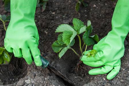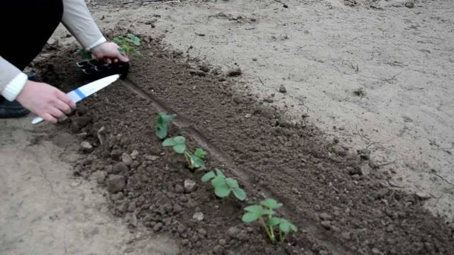 Nếu không sử dụng phân khoáng (supe lân, kali clorua) trong quá trình đào đất thì có thể bổ sung vào hố ngay trước khi trồng cây. Cây dâu giống từ các cốc phải được loại bỏ trong khi giữ đất trên cây nho. Nên cắt tỉa những rễ dâu tây có chiều dài trên 10 cm. Hố trồng phải đủ sâu để rễ cây có thể cắm thẳng đứng mà không bị uốn cong. Cổ rễ của bụi nên được đặt cao hơn mặt đất. Sau khi trồng cây, nên tưới nước và phủ lớp phủ lên các hốc có dâu tây.