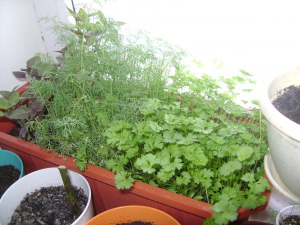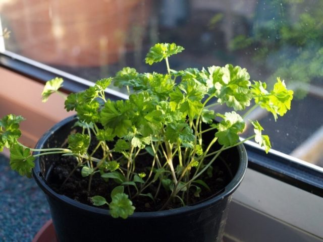 Khi trồng trên bệ cửa sổ, rau mùi tây không chỉ được tưới nước mà còn được phun sương vào buổi tối.