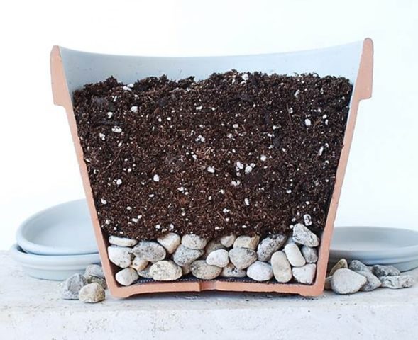 - Nồi thì là rửa sạch, rải một lớp đá nhỏ dưới đáy. Sau đó, đất đã chuẩn bị được đổ