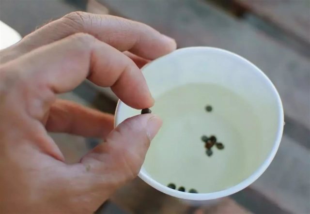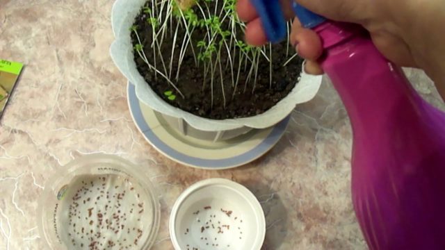Bước tiếp theo là gieo hạt. Quy trình này được thực hiện bằng cách sử dụng một thìa cà phê hoặc đơn giản là đổ nước có ngâm hạt vào một thùng chứa sao cho chúng nằm dọc theo các rãnh thành một lớp tương đối đồng đều.