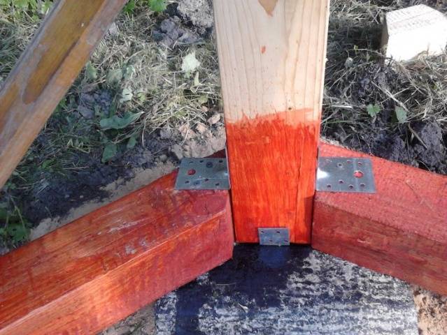 Khi bê tông đông cứng, chúng tôi lắp ráp khung dưới từ một thanh có tiết diện 100x100 mm. Chúng tôi đính kèm các bài viết thẳng đứng vào nó ở các góc. Để tăng cường các khớp nối của các thanh gỗ, chúng tôi sử dụng các phần tử kim loại trên cao. Lớp chống thấm được đặt giữa khung gỗ và đế bê tông.