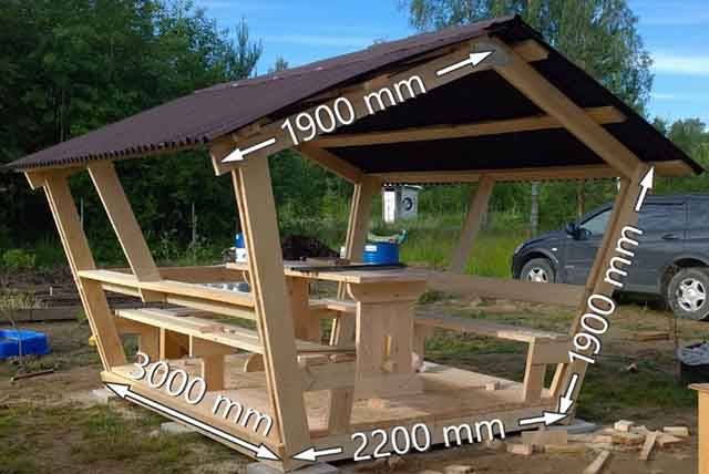 Bức ảnh cho thấy một ví dụ với kích thước của một vọng lâu trung bình được thiết kế cho một gia đình từ 6-8 người. Một mái đầu hồi nhẹ làm bằng ondulin được giữ cố định bằng các trụ gỗ nghiêng. Bên trong là một chiếc bàn với ba ghế dài.