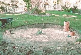 Đổ một lớp cát và sỏi dài 10 cm lên đáy đã được lót. Trên cùng, chúng tôi đặt một vật liệu chống thấm, một lưới gia cố và ván khuôn được dựng lên xung quanh hố. Đổ bê tông phần đế sao cho phần đế nhô ra khỏi mặt đất 10 cm.