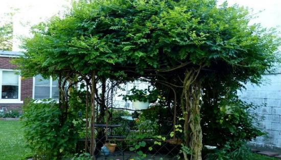 Cấu trúc dạng lưới có thể được sử dụng để làm khu vực giải trí sinh hoạt bằng cách trồng cây leo gần nó. Qua mùa hè, những cây dây leo sẽ bện tất cả các bức tường và trần nhà. Nó sẽ trở thành một nơi tuyệt vời để giải trí ngoài trời, như trong bức ảnh này.