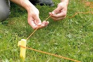 Vì chúng tôi đang xây dựng một vọng lâu theo hình lục giác, nên cần có 6 chiếc cọc để đánh dấu địa điểm. Chúng tôi đưa chúng vào mặt đất dọc theo đường viền của cấu trúc tương lai, nơi mỗi góc sẽ được đặt. Kéo dây giữa các cọc. Anh ấy sẽ phác thảo các đường viền của nền móng.