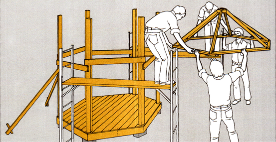 Chúng tôi nâng cấu trúc đã hoàn thiện với các trợ lý vào khung của vọng lâu, sau đó chúng tôi cố định nó bằng bu lông vào thanh của dây đai phía trên.