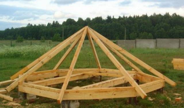 Bây giờ chúng ta lắp ráp khung mái trên mặt đất. Đầu tiên, từ một tấm ván có tiết diện 50x100 mm, chúng tôi đập xuống một khung hình lục giác theo kích thước của dây đai phía trên của các trụ của khung vọng lâu. Ta buộc chặt các chân kèo mỗi góc một góc sao cho tất cả đều quy tụ về một điểm chính giữa khung hình lục giác.