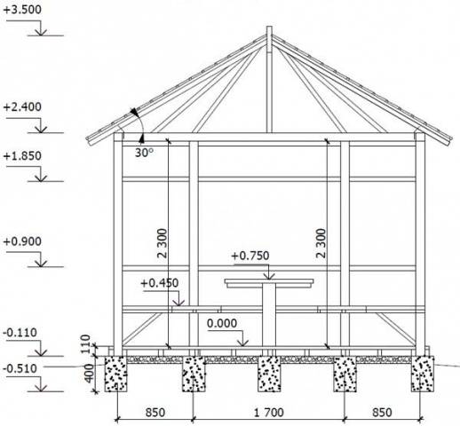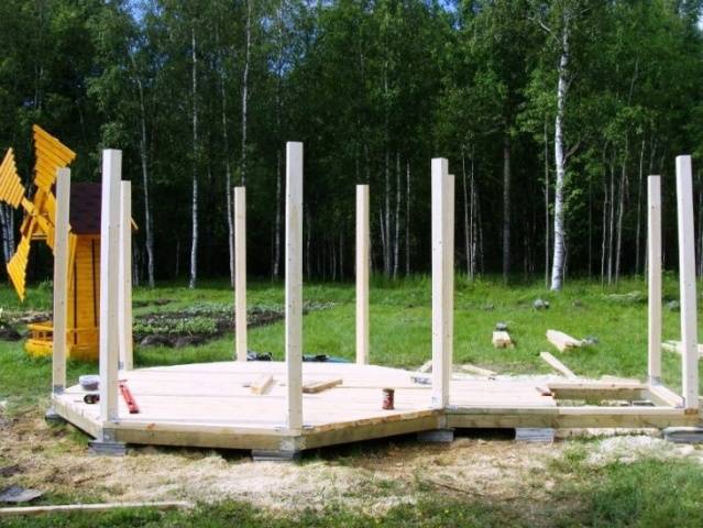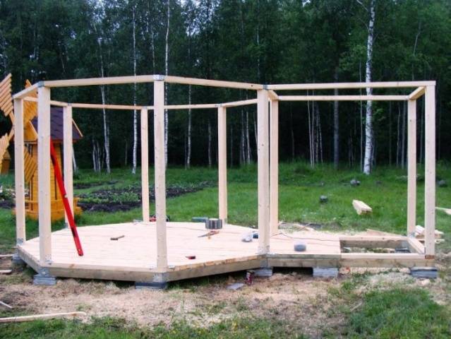 Bây giờ chúng ta sẽ xem xét từng bước làm thế nào để xây dựng một vọng lâu theo bản vẽ được đề xuất. Sau khi dọn sạch nơi có cây cối và mảnh vụn, chúng tôi bắt đầu làm việc: