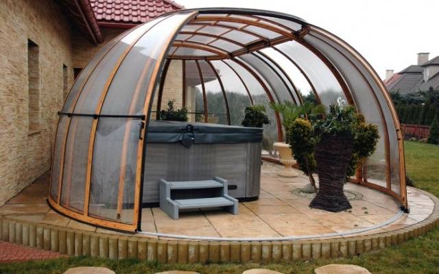 Có các lựa chọn ngân sách cho vọng lâu đóng cửa. Cấu trúc nhẹ bao gồm các trụ bằng gỗ hoặc gạch. Vai trò của các bức tường và cửa sổ được thực hiện bởi các tấm polycarbonate trong suốt. Với sự bắt đầu của thời tiết lạnh, rất khó để giữ ấm trong một căn phòng như vậy. Thiết kế này nhằm mục đích giải trí nhiều hơn vào mùa ấm. Những bức tường trong suốt chỉ che mưa và gió.