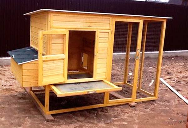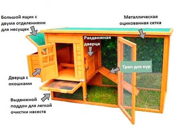 Cơ sở của chuồng gà di động là một khung làm bằng gỗ. Bên trái, một ngôi nhà nhỏ được cố định trên tầng hai. Không gian trống dưới nhà và bên hông được dành cho chuồng chim. Các bức tường bên của lối đi được che bằng lưới thép. Không có sàn bên trong chuồng, cho phép gà ngâm mình dưới đất và mổ cỏ. Phía trên chuồng gia cầm cùng với chuồng được lợp bằng mái tôn chống thấm. Một giải pháp thiết kế thành công như vậy cho phép gà đi dạo ngoài trời mưa.