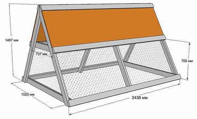 Đi bộ cho chuồng gà mini không nhất thiết phải có hình chữ nhật. Để đơn giản hóa công việc và tiết kiệm vật liệu, sơ đồ của một bao vây hình tam giác trong hình dạng của một ngôi nhà được trình bày trong ảnh sẽ giúp ích cho bạn.