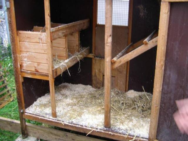 - Trên bức tường của chuồng gia cầm, đi vào bên trong chuồng chim, một lỗ được khoét bằng một chiếc máy ghép hình bằng điện. Dưới đó, các móc được làm bằng móc cho thang có thể tháo rời, được làm từ một tấm ván rộng 30 cm với các thanh được nhồi ngang.
