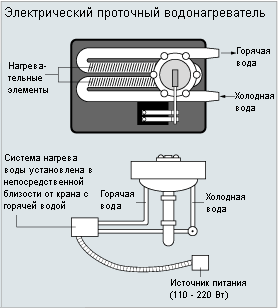Trong bình đun nước nóng lưu trữ, nước được làm nóng bên trong bình từ bộ phận làm nóng bằng điện. Các thiết bị tạo dòng chảy tương tự được trang bị một phần tử gia nhiệt hoặc xoắn ốc, chỉ khác là chúng làm nóng chất lỏng trong quá trình chuyển động của nó. Mặc dù công suất cao của lò sưởi điện, các mô hình chạy qua đôi khi có lợi hơn khi sử dụng so với các mô hình lưu trữ. Thực tế là bộ phận làm nóng tiêu thụ điện khi nước được phân tích. Trong bể chứa, máy sưởi định kỳ bật suốt ngày đêm, ngay cả khi không lấy mẫu nước.