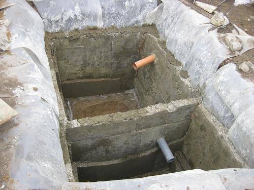 Đáy được đổ bê tông trước, đổ dung dịch có độ dày 150 mm. Sau khi nó đã đông cứng, ván khuôn được xây dựng xung quanh chu vi của thành hố. Bê tông được đổ vào bên trong các hốc kết quả bằng lưới gia cố.