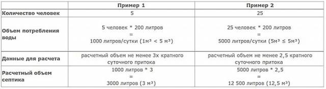 Trong các hệ thống cống phức tạp, thể tích của các khoang bể tự hoại được tính toán có tính đến nhiều chỉ tiêu. Đối với một ngôi nhà nhỏ mùa hè, chỉ cần tuân theo một sơ đồ đơn giản là đủ. Ví dụ về phép tính có thể được lấy từ bảng.