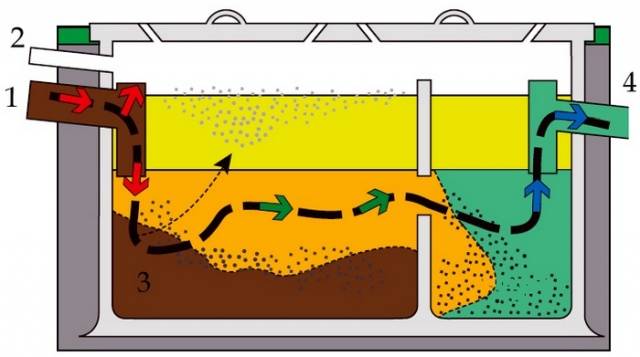 Hầm tự hoại hoạt động theo nguyên tắc làm sạch nhiều giai đoạn. Nước thải qua đường ống thoát nước thải rơi vào khoang đầu tiên - bể chứa. Chất thải được chia thành các phần lỏng và rắn. Bùn lắng ở đáy của ngăn đầu tiên, và nước chảy qua ống tràn vào ngăn tiếp theo, nơi nó được tinh lọc thêm. Đối với bể phốt có kiến ba khoang, quy trình được lặp lại. Tức là chất lỏng từ ngăn thứ hai chảy qua ống tràn vào ngăn chứa thứ ba. Cho dù một bể tự hoại có bao nhiêu ngăn, chất lỏng tinh khiết từ bể cuối cùng được thoát qua các ống thoát nước đến cánh đồng lọc, nơi diễn ra giai đoạn cuối cùng làm sạch và hấp thụ vào đất.