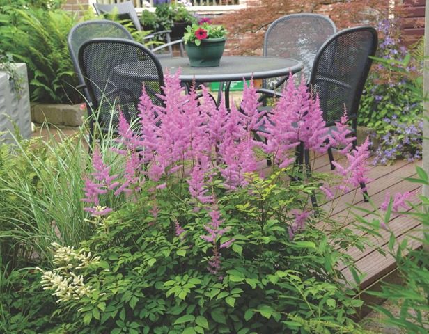 Astilba, nằm không xa bàn ngoài trời, sẽ giúp tạo ra một bầu không khí yên bình trong nước.