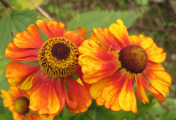 Chùm hoa của giống helenium lâu năm này khá lớn, đường kính tới 6 cm, lưỡi màu vàng chanh hoặc đỏ rượu, viền vàng, tâm màu vàng nâu.