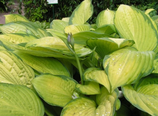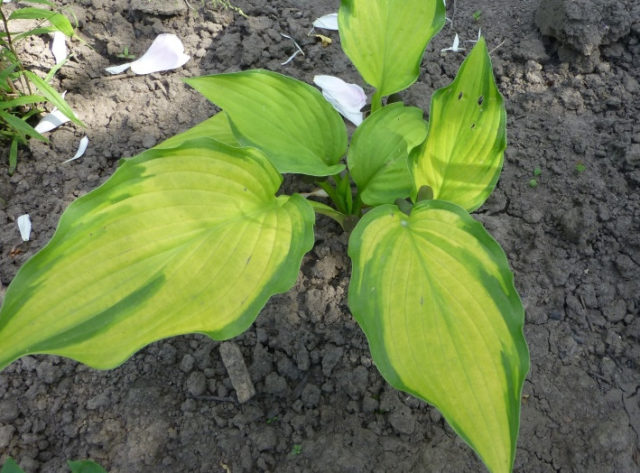 Các lá của cây hosta "Tiêu chuẩn vàng" là lá gốc. Chúng có hình trái tim với đầu nhọn. Về chiều dài chúng đạt 12-14 cm.