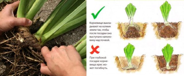 Thuật toán từng bước để trồng cây diên vĩ vào mùa xuân khá đơn giản. Các giống thân rễ được trồng trong các hố nông, ở trung tâm có một gò đất được đổ. Thân rễ được đặt trên đó, và các thùy thẳng ở hai bên. Sau đó, hố được đắp cẩn thận bằng đất, được lu lèn định kỳ. Kết quả là, chồi trên phải nằm hoàn toàn trên mặt đất. Nếu bạn đào sâu nó, thì hoa diên vĩ sẽ không nở.